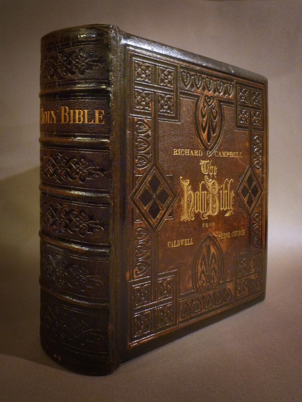 Beautiful ornate leather binding with the back and front showing different optional colors of leather and.