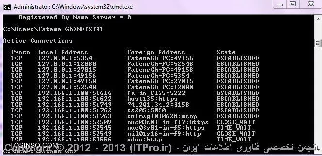Dr zyr mthaly ra aaordh am. Aamozsh kaml dstor ipconfig atlaaaat az kbl ip subnet mask o default gateway hr kart shbkh ra jdaganh nshan m dhd. Dstor netstat hmannd dgr dstorat dara paramtrha mfd bodh kh aamlkrd dstor ra bhbod m bkhshnd. Dr sfhh baz shdh dstor netstat on ra oard krdh o enter nmad.